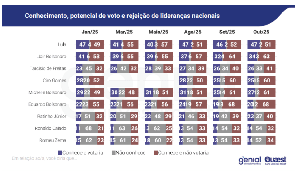 Divulgada na semana passada, a 18ª rodada da pesquisa Genial/Quaest coroou um período de boas notícias para o governo. Apontou a recuperação da popularidade do presidente Lula e a consolidação de sua vantagem frente a qualquer um dos pré-candidatos à Presidência da República. Números ainda mais significativos vieram em outra coluna pouco badalada: a da rejeição. Lula foi o único entre os nove postulantes que reduziu o percentual dos eleitores que o conhecem e não votariam nele.